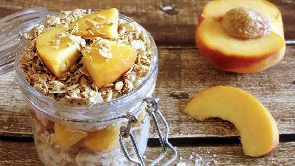 Aiming to cut meal prep time? This overnight oats recipe takes five minutes to make. Diced peaches and Greek yogurt – sweetened up with Pure Vanilla Extract and Liquid Honey Beehive – go down easy and will keep you full all morning.
