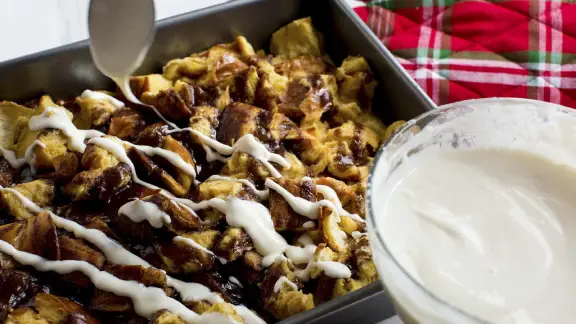 This overnight breakfast casserole recipe entices with the flavours of Ground Cinnamon and Pure Vanilla Extract, plus cream cheese frosting.