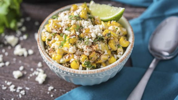 First up is a bowl-based version of a classic Mexican street food snack: Elote. Traditionally, this dish slathers corn on the cob with a mayo sauce, chili powder, cheese and a squeeze of lime. Our Mexican-Style Corn Salad recipe reinvents Elotes in a bowl. Charred skillet corn along with fiery jalapeño and our Chili Powder bring the spice, while creamy mayonnaise and fresh cilantro temper the heat with some fresh, cool flavours. Crumbled cotija cheese adds an extra layer of salty taste to a dish that's perfect at a beach barbecue.