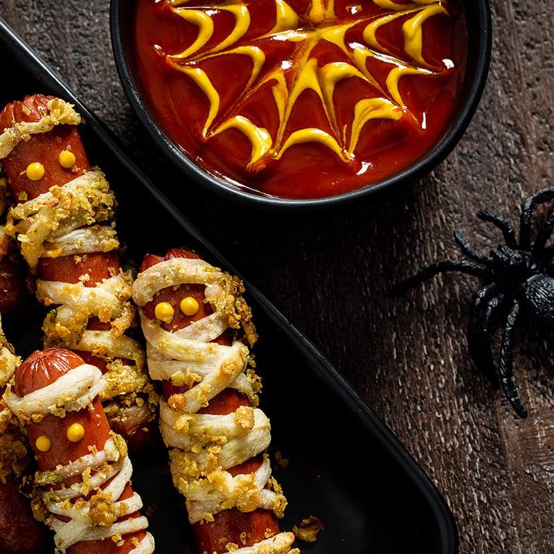 Perfect for Halloween, this spooky version of Pigs in a Blanket is made with pizza dough and topped with Crispy Jalapeños. Try them if you dare. . .