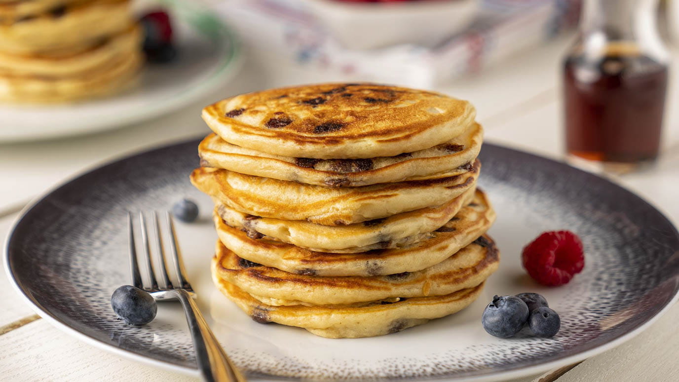 These fluffy buttermilk pancakes are made extra-rich and decadent with the addition of chocolate chips.