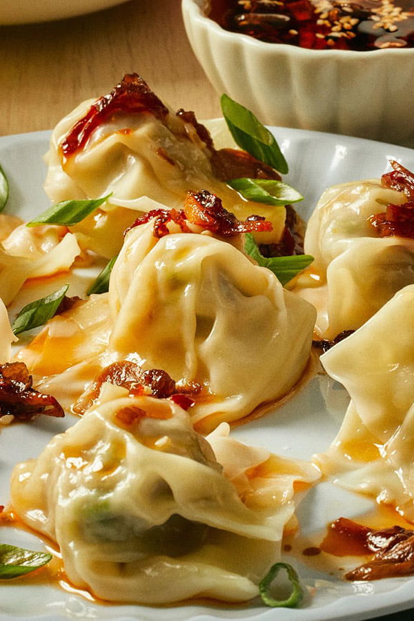 Pork dumplings swimming in a silky soy and black vinegar sauce make an easy, approachable excuse to try homemade chili crisp.