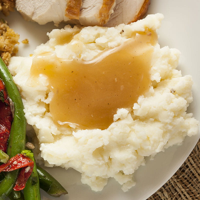 Topped with rich, velvety gravy, these fluffy mashed potatoes are a classic side dish to roasted turkey. This easy mashed potato recipe only has 5 ingredients and is ready in around 20 minutes.
