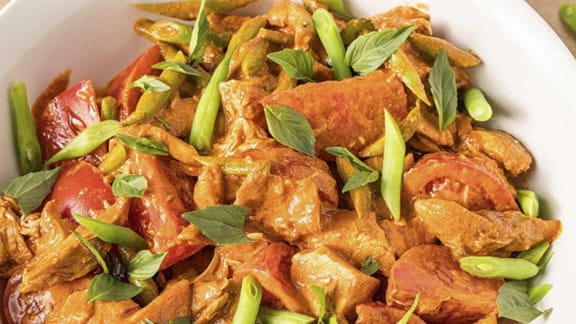 Sauté avec de la pâte au cari rouge, mijoté dans du lait de coco et rehaussé de sauce de poisson de qualité, ce cari rouge est toujours satisfaisant. Ce plat est tout simplement délicieux avec du riz au jasmin.