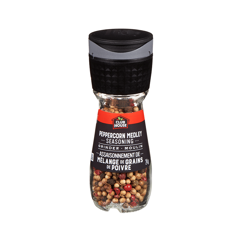Une combinaison colorée de grains entiers de poivre noir, blanc, vert et rose, de piment de la Jamaïque entier et de graines de coriandre entières. Utilisez ce moulin en cuisine pour ajouter de merveilleuses saveurs et des arômes étonnants à tous vos plats.