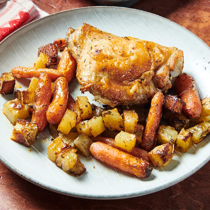 Préparez une alléchante plaque composée de poulet, de pommes de terre et de carottes assaisonnés d’herbes et d’épices méditerranéennes.
